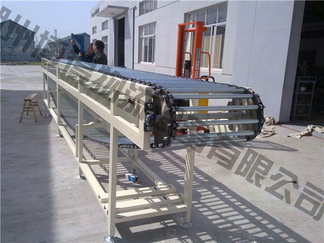 鏈條輸送機(jī)是以鏈條作為牽引和承載體輸送物料,鏈條可以采用普通的套筒滾子輸送鏈,也可采用其它各種特種鏈條(如積放鏈,倍速鏈)。鏈條輸送機(jī)的輸送能力大,主要輸送托盤(pán)、大型周轉(zhuǎn)箱等。輸送鏈條結(jié)構(gòu)形式多樣,并且有多種附件,易于實(shí)現(xiàn)積放輸送,可用做裝配生產(chǎn)線或作為物料的儲(chǔ)存輸送。標(biāo)準(zhǔn)輸送機(jī)寬度為 200、300、400、500、600、700、800、1000、1200、1500、2000mm等,也可按客戶需求采用其它特殊規(guī)格。